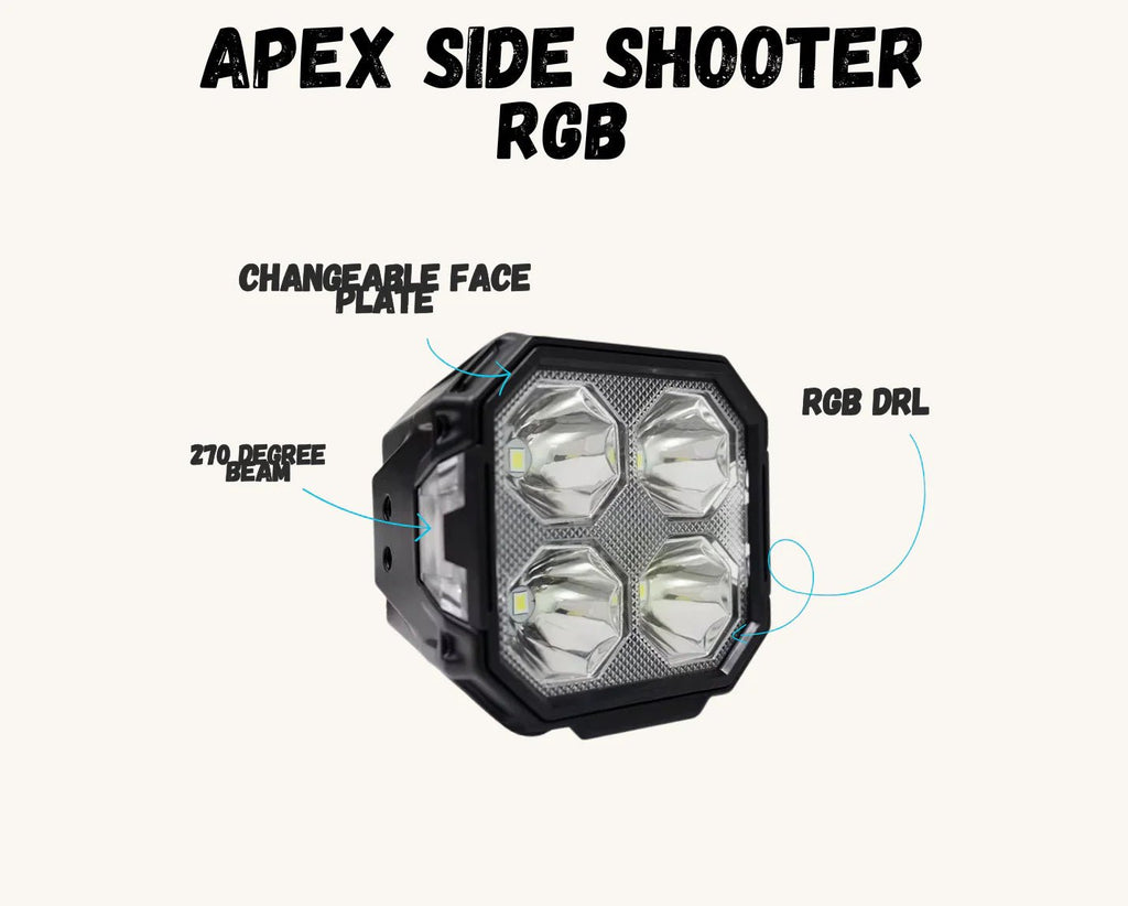 The Apex Side Shooter-3 RGB delivers powerful 52W illumination with a focused spot beam and side shooter for enhanced visibility. Operating between 10-30V, each 3-inch pod produces 5384 lumens and features an IP68 waterproof rating for durability in harsh conditions. With a 50,000-hour lifespan and customizable RGB DRL and faceplates, it offers both performance and style. Ready to install with included wiring harness, these lights are ideal for off-road enthusiasts seeking reliable, versatile lighting solutions. Sold as pairs.